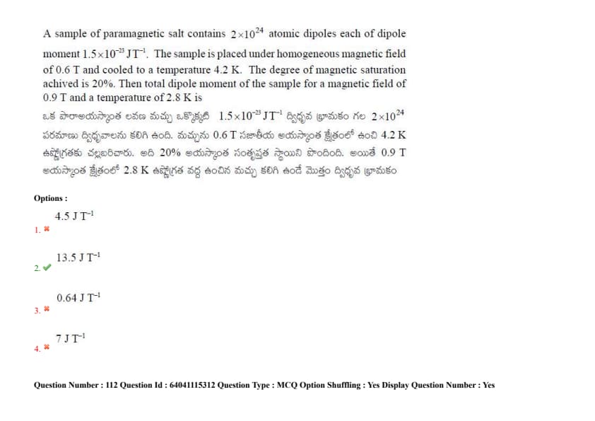 A sample of paramagnetic salt contains \(2 \times 10^{24}\) atomic dipoles each of dipole moment \(1.5 \times 10^{-23} \, JT^{-1}\). The sample is placed under homogeneous magnetic field of 0.6 T and cooled to a temperature 4.2 K. The degree of magnetic saturation achieved is 20%. Then total dipole moment of the sample for a magnetic field of 0.9 T and a temperature of 2.8 K is