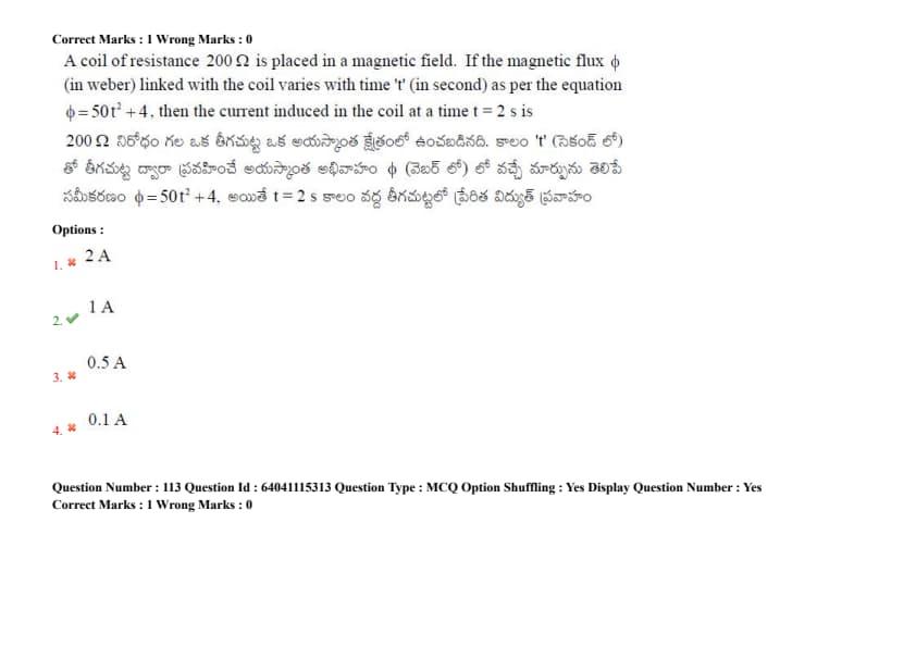 A coil of resistance 200 \(\Omega\) is placed in a magnetic field. If the magnetic flux \(\phi\) (in weber) linked with the coil varies with time 't' (in second) as per the equation \(\phi = 50t^2 + 4\), then the current induced in the coil at a time t = 2 s is