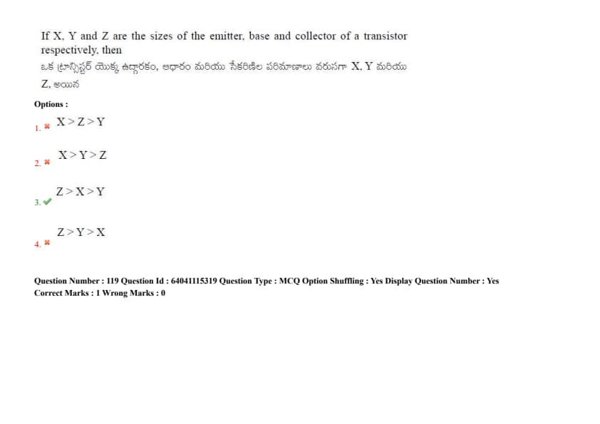 If X, Y and Z are the sizes of the emitter, base and collector of a transistor respectively, then