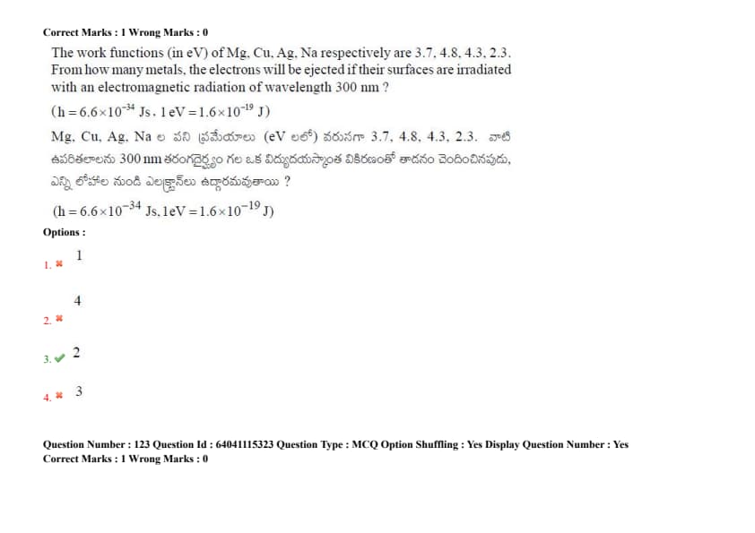The work functions (in eV) of Mg, Cu, Ag, Na respectively are 3.7, 4.8, 4.3, 2.3. From how many metals, the electrons will be ejected if their surfaces are irradiated with an electromagnetic radiation of wavelength 300 nm? (h = \(6.6 \times 10^{-34}\) Js, 1 eV = \(1.6 \times 10^{-19}\) J)