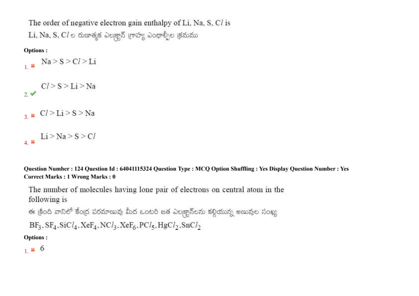 The order of negative electron gain enthalpy of Li, Na, S, Cl is