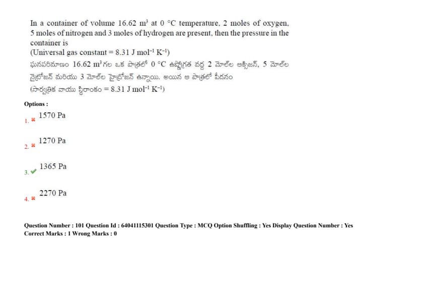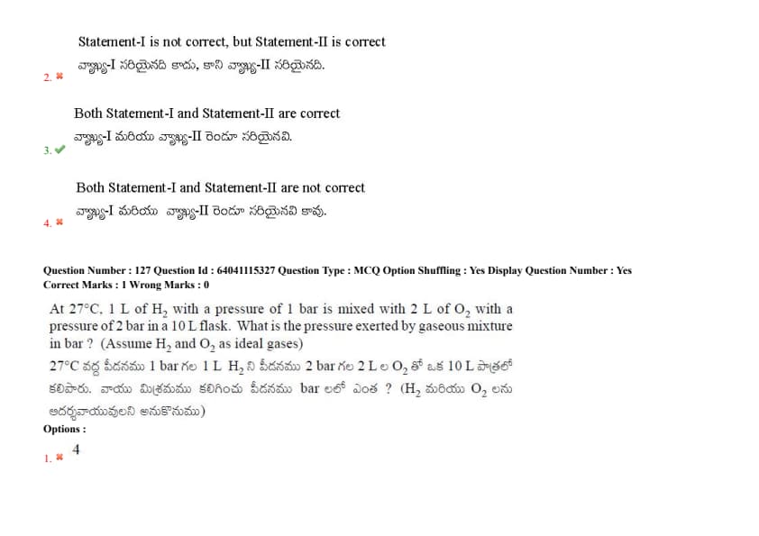 At 27\(^{\circ}\)C, 1 L of H\(_2\) with a pressure of 1 bar is mixed with 2 L of O\(_2\) with a pressure of 2 bar in a 10 L flask. What is the pressure exerted by gaseous mixture in bar? (Assume H\(_2\) and O\(_2\) as ideal gases)