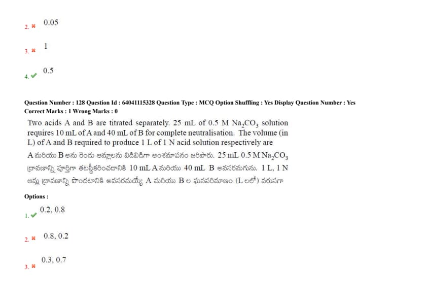 Two acids A and B are titrated separately. 25 mL of 0.5 M Na\(_2\)CO\(_3\) solution requires 10 mL of A and 40 mL of B for complete neutralisation. The volume (in L) of A and B required to produce 1 L of 1 N acid solution respectively are