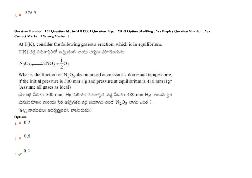 At T(K), consider the following gaseous reaction, which is in equilibrium: N\(_2\)O\(_5 \rightleftharpoons 2\)NO\(_2 + \frac{1}{2}\)O\(_2\). What is the fraction of N\(_2\)O\(_5\) decomposed at constant volume and temperature, if the initial pressure is 300 mm Hg and pressure at equilibrium is 480 mm Hg? (Assume all gases as ideal)