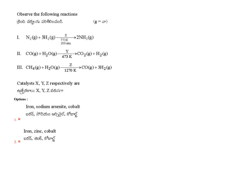 I. N\(_2\)(g) + 3H\(_2\)(g) \(\xrightarrow[200 atm]{773K, X}\) 2NH\(_3\)(g)