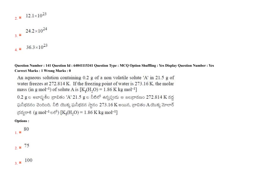 An aqueous solution containing 0.2 g of a non-volatile solute 'A' in 21.5 g of water freezes at 272.814 K. If the freezing point of water is 273.16 K, the molar mass (in g mol\(^{-1}\)) of solute A is [K\(_f\)(H\(_2\)O) = 1.86 K kg mol\(^{-1}\)]