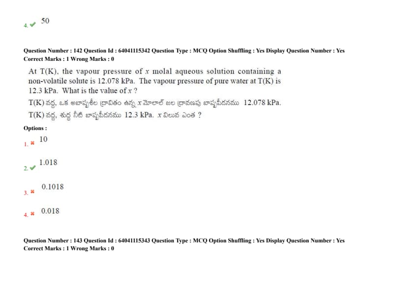 At T(K), the vapor pressure of x molal aqueous solution containing a non-volatile solute is 12.078 kPa. The vapor pressure of pure water at T(K) is 12.3 kPa. What is the value of x?