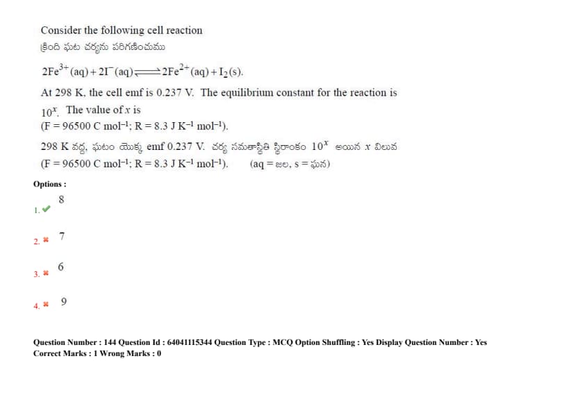 Consider the following cell reaction: 2Fe\(^{3+}\)(aq) + 2I\(^-\) (aq) \(\rightarrow\) 2Fe\(^{2+}\)(aq) + I\(_2\)(s). At 298 K, the cell emf is 0.237 V. The equilibrium constant for the reaction is 10\(^x\). The value of x is (F = 96500 C mol\(^{-1}\); R = 8.3 J K\(^{-1}\) mol\(^{-1}\))