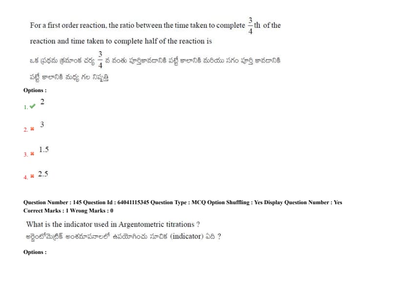 For a first-order reaction, the ratio between the time taken to complete \(\frac{3}{4}\)th of the reaction and time taken to complete half of the reaction is