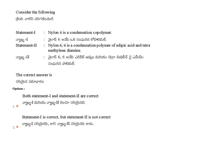 Statement-II: Nylon 6,6 is a condensation polymer of adipic acid and tetramethylene diamine.