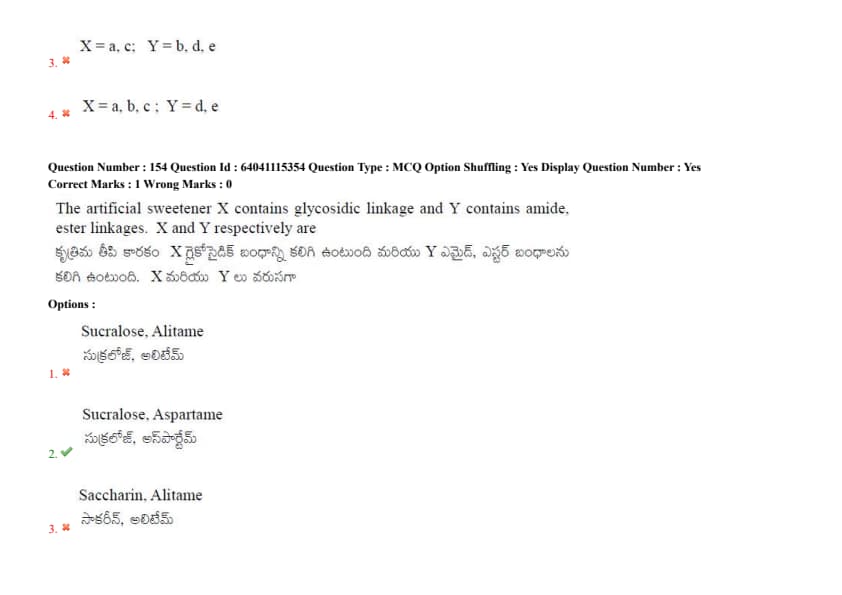 The artificial sweetener X contains glycosidic linkage and Y contains amide and ester linkages. X and Y respectively are
