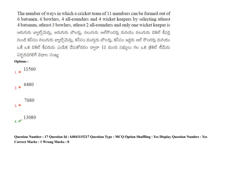 The number of ways in which a cricket team of 11 members can be formed out of 6 batsmen, 6 bowlers, 4 all-rounders, and 4 wicket-keepers by selecting at least 4 batsmen, at least 3 bowlers, at least 2 all-rounders, and only one wicket-keeper is