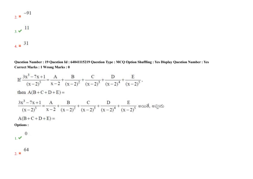 If \(\frac{3x^2 - 7x + 1}{(x - 2)^3} = \frac{A}{x - 2} + \frac{B}{(x - 2)^2} + \frac{C}{(x - 2)^3}\), then \(A(B + C + D + E) =\)