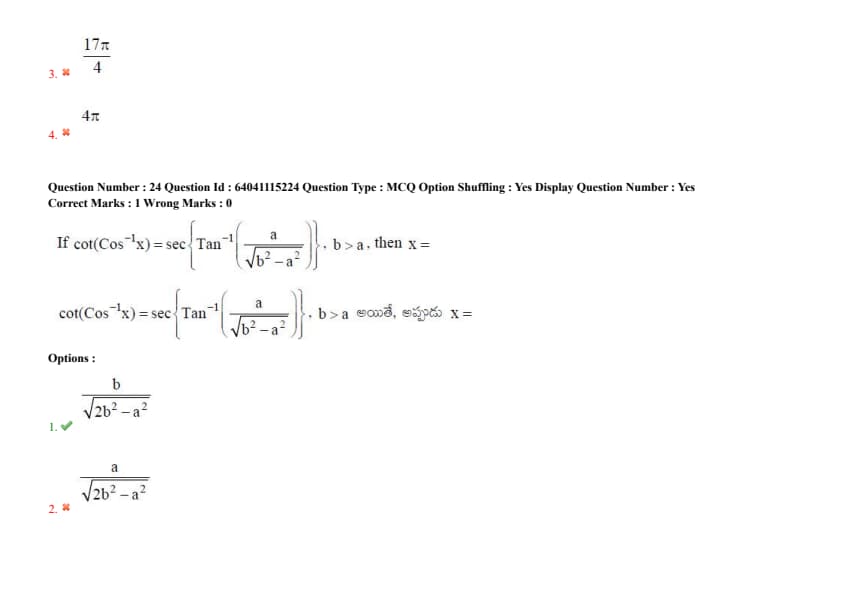 If \(\cot(\cos^{-1} x) = \sec\left(\tan^{-1}\left(\frac{a}{\sqrt{b^2 - a^2}}\right)\right)\), \(b > a\), then \(x =\)