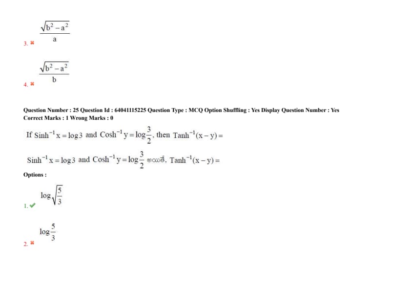 If \(\sinh^{-1}(x) = \log 3\) and \(\cosh^{-1}(y) = \log\left(\frac{3}{2}\right)\), then \(\tanh^{-1}(x - y) =\)
