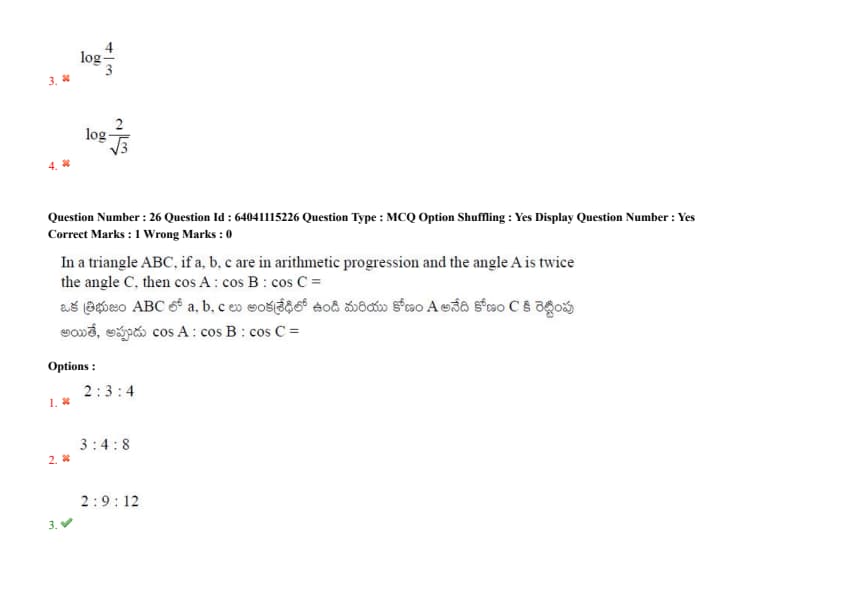 In a triangle ABC, if \(a, b, c\) are in arithmetic progression and the angle \(A\) is twice the angle \(C\), then \(\cos A : \cos B : \cos C =\)
