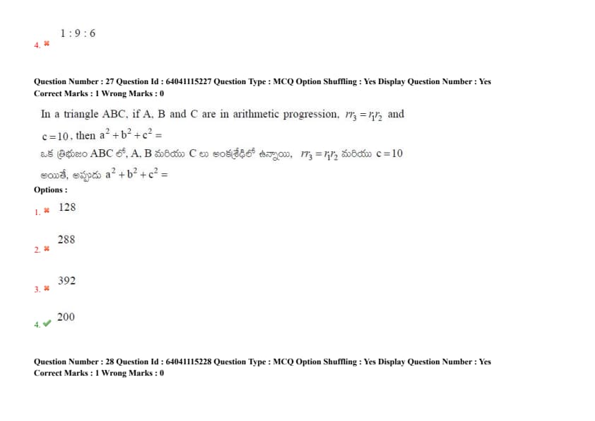 In a triangle ABC, if A, B, and C are in arithmetic progression, \(r_3 = r_1 r_2\), and \(c = 10\), then \(a^2 + b^2 + c^2 =\)