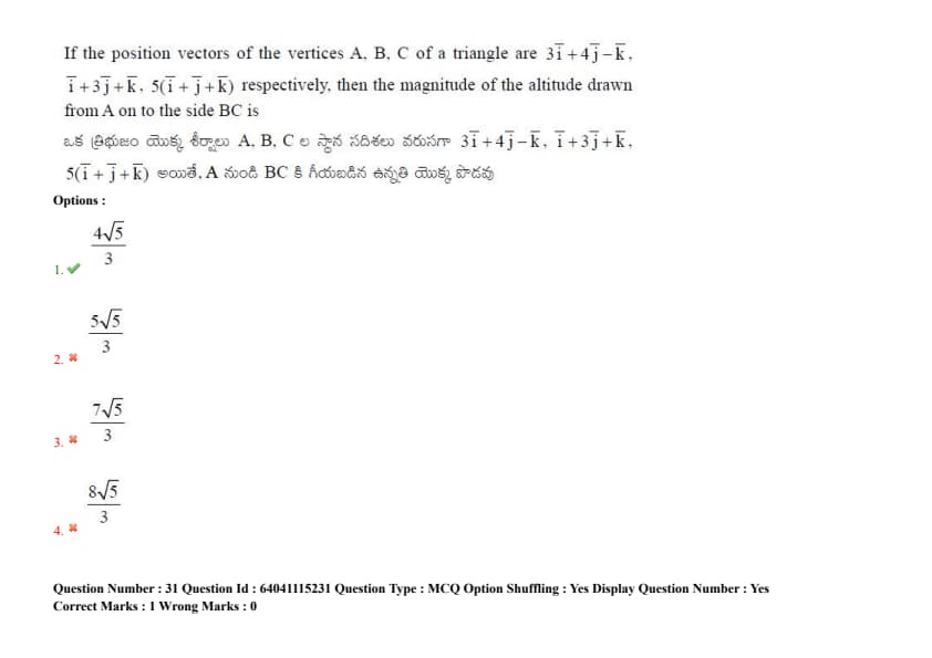 If the position vectors of the vertices A, B, C of a triangle are \(3\mathbf{i} + 4\mathbf{j} - \mathbf{k}\), \(\mathbf{i} + 3\mathbf{j} + \mathbf{k}\), and \(5(\mathbf{i} + \mathbf{j} + \mathbf{k})\) respectively, then the magnitude of the altitude drawn from A onto the side BC is