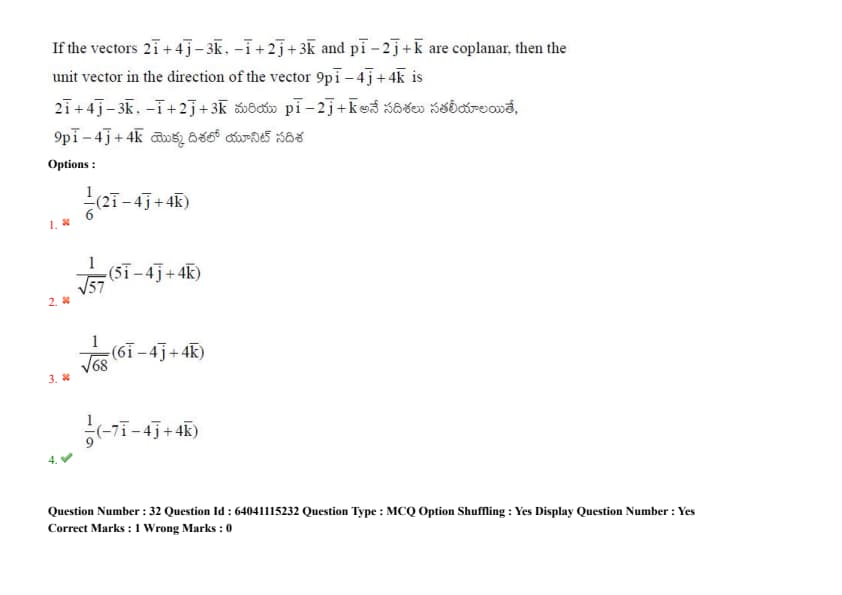 If the vectors \(2\mathbf{i} + 4\mathbf{j} - 3\mathbf{k}\), \(-\mathbf{i} + 2\mathbf{j} + 3\mathbf{k}\), and \(p\mathbf{i} - 2\mathbf{j} + \mathbf{k}\) are coplanar, then the unit vector in the direction of the vector \(9p\mathbf{i} - 4\mathbf{j} + 4\mathbf{k}\) is