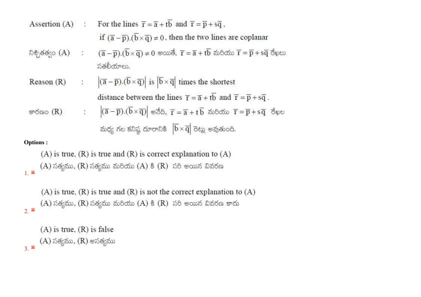 Assertion (A): For the lines \(\mathbf{r} = \mathbf{a} + t \mathbf{b}\) and \(\mathbf{r} = \mathbf{p} + s \mathbf{q}\), if \((\mathbf{a} - \mathbf{p}) \cdot (\mathbf{b} \times \mathbf{q}) \neq 0\), then the two lines are coplanar. Reason (R): \(|(\mathbf{a} - \mathbf{p}) \cdot (\mathbf{b} \times \mathbf{q})|\) is \(|\mathbf{b} \times \mathbf{q}|\) times the shortest distance between the lines \(\mathbf{r} = \mathbf{a} + t \mathbf{b}\) and \(\mathbf{r} = \mathbf{p} + s \mathbf{q}\).