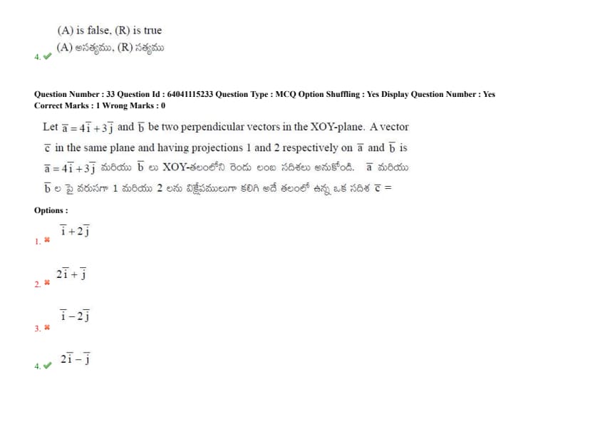 Let \(\mathbf{a} = 4\mathbf{i} + 3\mathbf{j}\) and \(\mathbf{b}\) be two perpendicular vectors in the XOY-plane. A vector \(\mathbf{c}\) in the same plane and having projections 1 and 2 respectively on \(\mathbf{a}\) and \(\mathbf{b}\) is