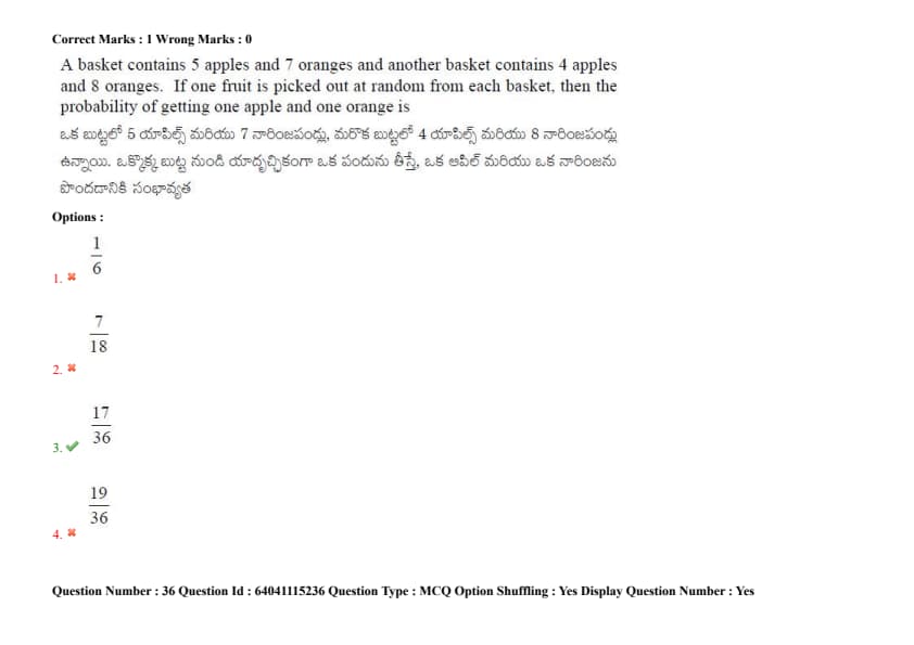 A basket contains 5 apples and 7 oranges, and another basket contains 4 apples and 8 oranges. If one fruit is picked out at random from each basket, then the probability of getting one apple and one orange is