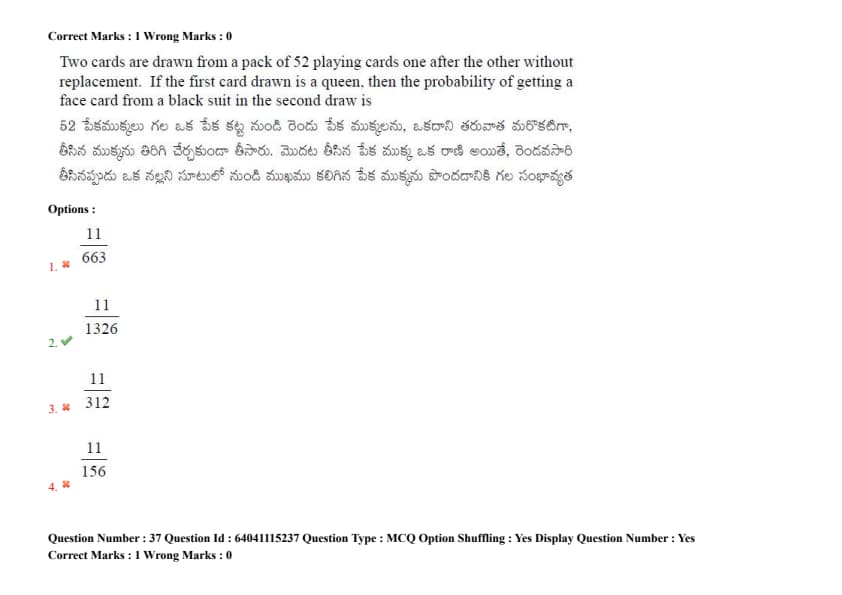Two cards are drawn from a pack of 52 playing cards one after the other without replacement. If the first card drawn is a queen, then the probability of getting a face card from a black suit in the second draw is