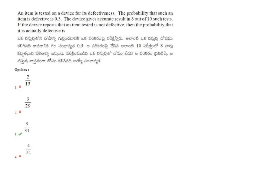 An item is tested on a device for its defectiveness. The probability that such an item is defective is 0.3. The device gives an accurate result in 8 out of 10 such tests. If the device reports that an item tested is not defective, then the probability that it is actually defective is