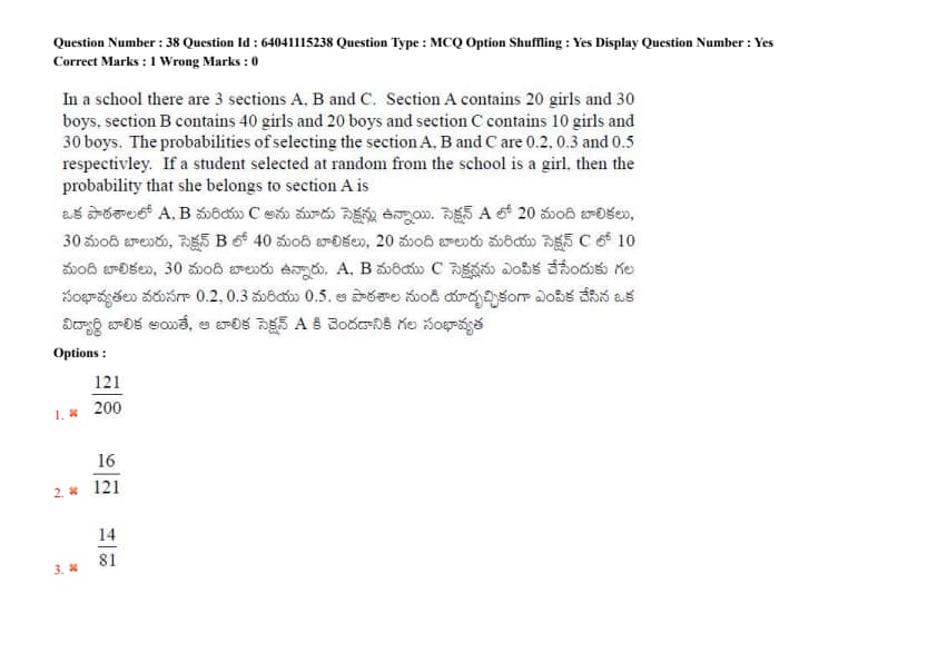 In a school there are 3 sections A, B, and C. Section A contains 20 girls and 30 boys, section B contains 40 girls and 20 boys, and section C contains 10 girls and 30 boys. The probabilities of selecting section A, B, and C are 0.2, 0.3, and 0.5, respectively. If a student selected at random from the school is a girl, then the probability that she belongs to section A is