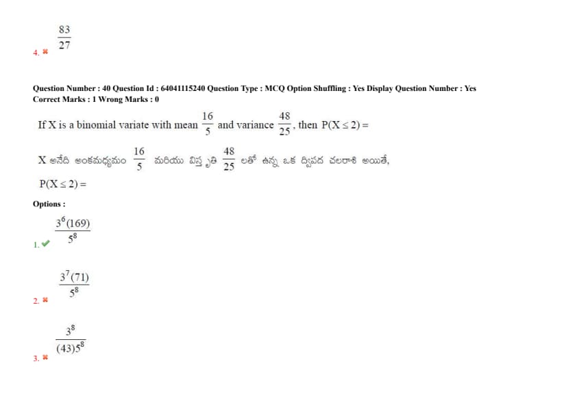If \(X\) is a binomial variate with mean \(\frac{16}{5}\) and variance \(\frac{48}{25}\), then \(P(X \leq 2) =\)