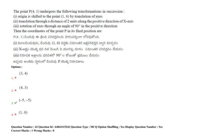 The point P(4, 1) undergoes the following transformations in succession: (i) origin is shifted to the point (1, 6) by translation of axes, (ii) translation through a distance of 2 units along the positive direction of the x-axis, (iii) rotation of axes through an angle of \(90^\circ\) in the positive direction. Then the coordinates of the point P in its final position are