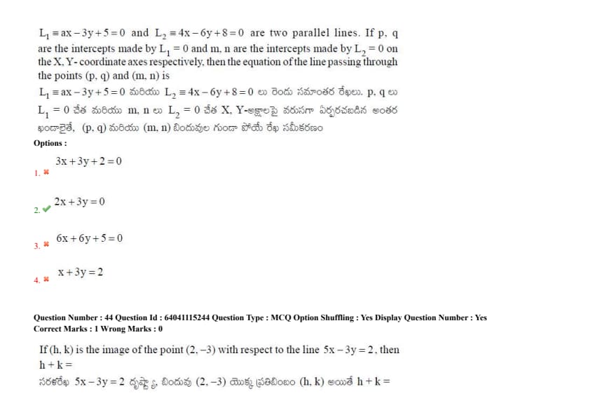 \(L_1 = ax - 3y + 5 = 0\) and \(L_2 = 4x - 6y + 8 = 0\) are two parallel lines. If \(p, q\) are the intercepts made by \(L_1 = 0\) and \(m, n\) are the intercepts made by \(L_2 = 0\) on the X and Y coordinate axes, respectively, then the equation of the line passing through the points \((p, q)\) and \((m, n)\) is