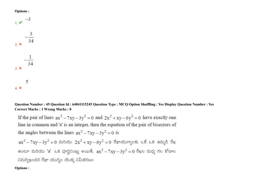 If the pair of lines \(ax^2 - 7xy - 3y^2 = 0\) and \(2x^2 + xy - 6y^2 = 0\) have exactly one line in common and '\(a\)' is an integer, then the equation of the pair of bisectors of the angles between the lines \(ax^2 - 7xy - 3y^2 = 0\) is