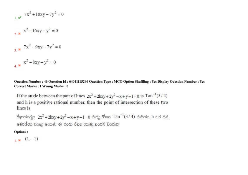 If the angle between the pair of lines \(2x^2 + 2hxy + 2y^2 - x + y - 1 = 0\) is \(\tan^{-1}\left(\frac{3}{4}\right)\) and \(h\) is a positive rational number, then the point of intersection of these two lines is