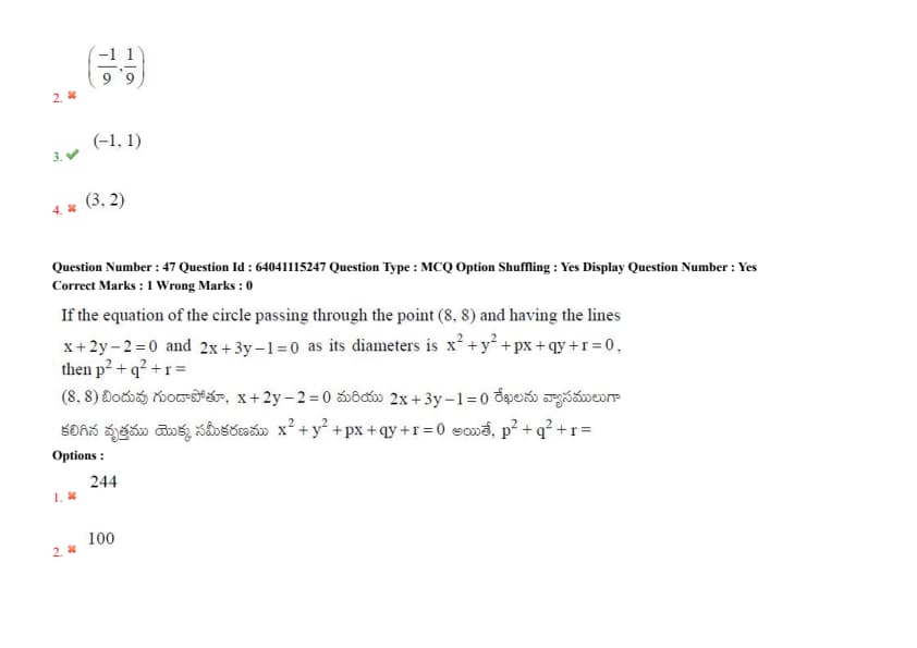 If the equation of the circle passing through the point \((8, 8)\) and having the lines \(x + 2y - 2 = 0\) and \(2x + 3y - 1 = 0\) as its diameters is \(x^2 + y^2 + px + qy + r = 0\), then \(p^2 + q^2 + r =\)