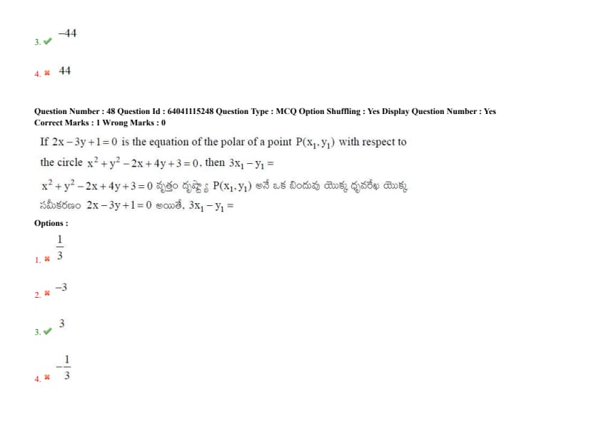 If \(2x - 3y + 1 = 0\) is the equation of the polar of a point \(P(x_1, y_1)\) with respect to the circle \(x^2 + y^2 - 2x + 4y + 3 = 0\), then \(3x_1 - y_1 =\)