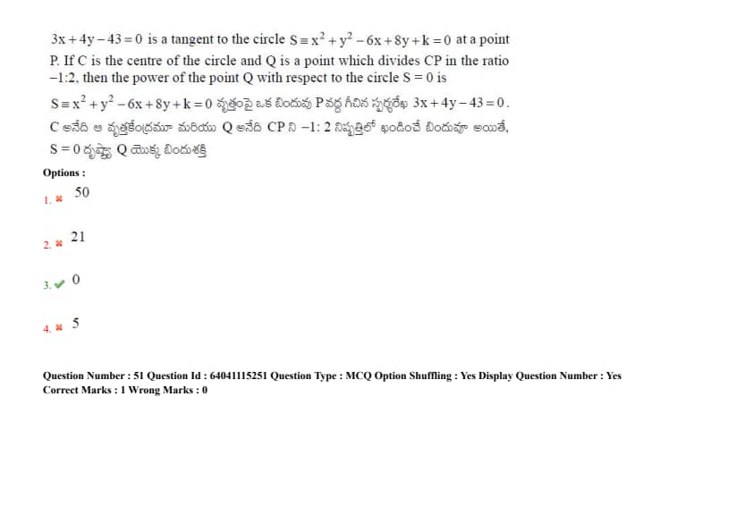 \(3x+4y-43=0\) is a tangent to the circle \(S = x^2+y^2-6x+8y+k=0\) at a point P. If C is the center of the circle and Q is a point which divides CP in the ratio -1:2, then the power of the point Q with respect to the circle S=0 is