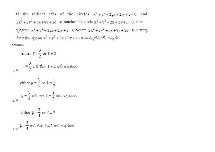 If the radical axis of the circles \(x^2+y^2+2gx+2fy+c=0\) and \(2x^2 + 2y^2 + 3x + 8y + 2c = 0\) touches the circle \(x^2 + y^2 + 2x + 2y + 1 = 0\), then