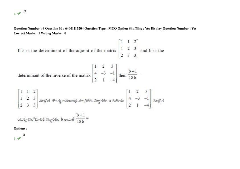 2 & 1 & 4 \end{bmatrix}\), then \(\frac{b+1}{18b} = \)