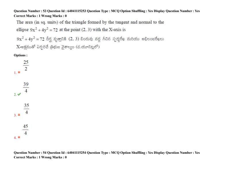 The area (in sq. units) of the triangle formed by the tangent and normal to the ellipse \( 9x^2 + 4y^2 = 72 \) at the point (2, 3) with the X-axis is