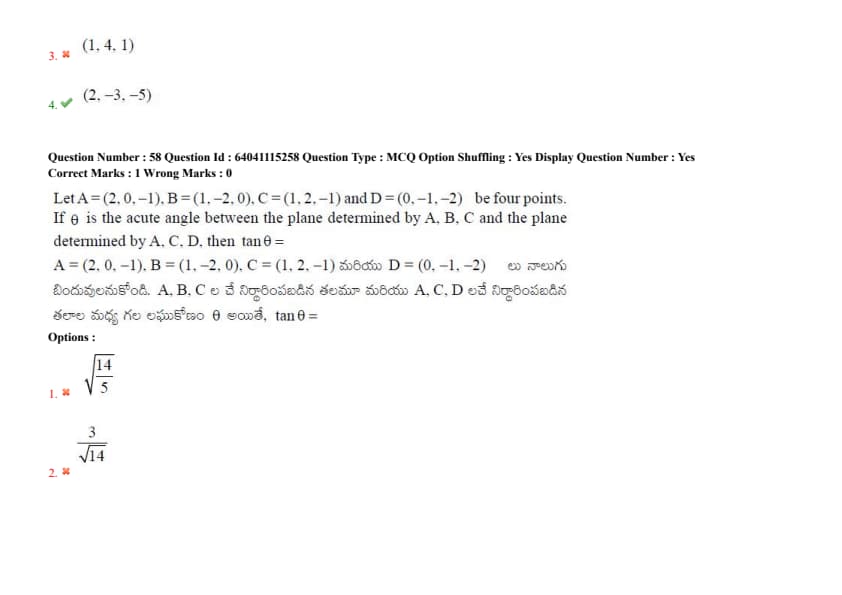 Let A = (2, 0, -1), B = (1, -2, 0), C = (1, 2, -1), and D = (0, -1, -2) be four points. If \(\theta\) is the acute angle between the plane determined by A, B, C and the plane determined by A, C, D, then \(\tan\theta =\)