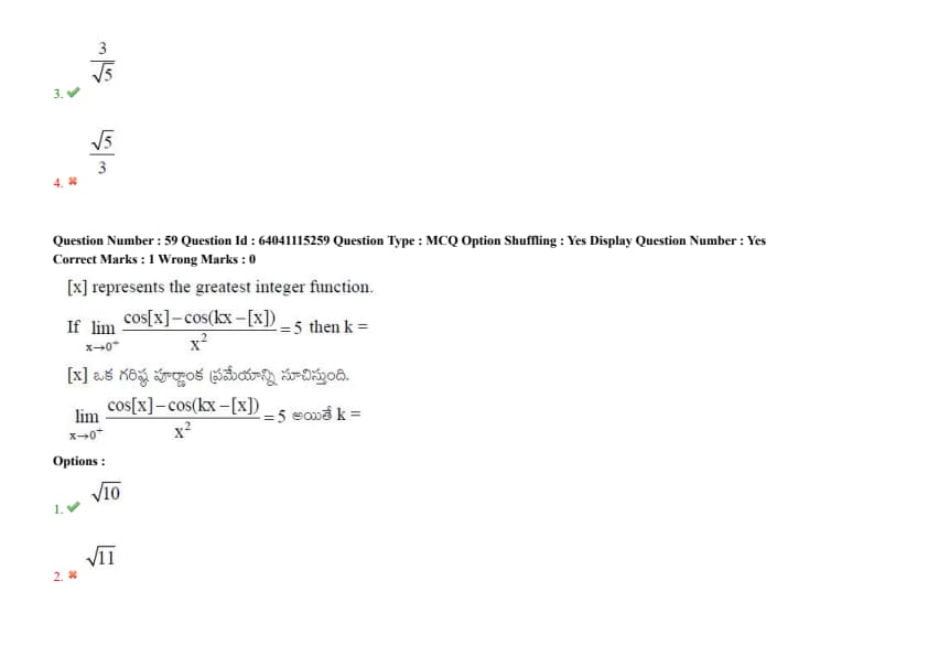 Let \([x]\) represent the greatest integer function. If \(\lim_{x \to 0^+} \frac{\cos[x] - \cos(kx - [x])}{x^2} = 5\), then \(k =\)