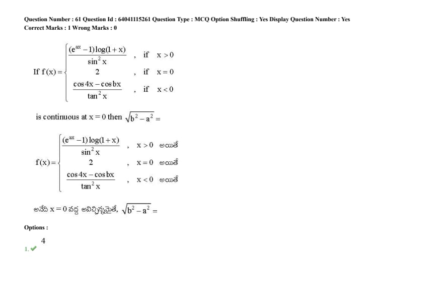 \frac{\cos 4x - \cos bx}{\tan^2 x} & if x < 0 \end{cases} \) is continuous at \( x = 0 \), then \(\sqrt{b^2 - a^2} =\)