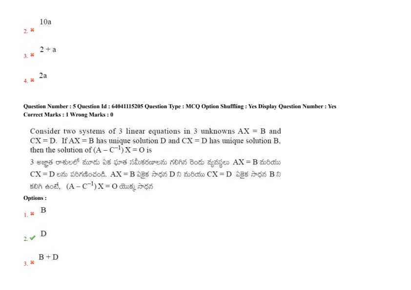 Consider two systems of 3 linear equations in 3 unknowns \(AX = B\) and \(CX = D\). If \(AX = B\) has the unique solution \(X = D\) and \(CX = D\) has the unique solution \(X = B\), then the solution of \((A - C^{-1})X = 0\) is