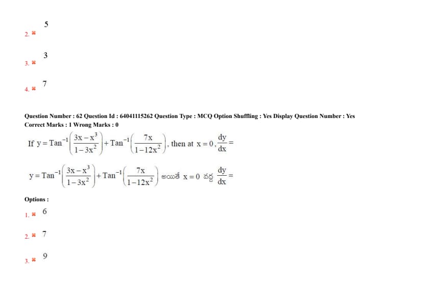 If \(y = \tan^{-1}(\frac{3x - x^3}{1-3x^2}) + \tan^{-1}(\frac{7x}{1-12x^2})\), then at \(x=0\), \(\frac{dy}{dx} =\)