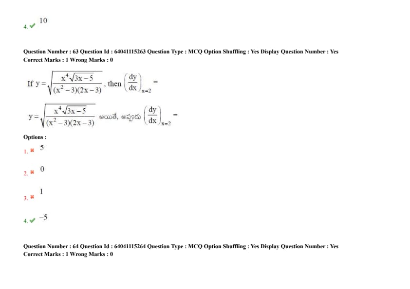 If \(y = \frac{x^4\sqrt{3x-5}}{\sqrt{(x^2-3)(2x-3)}}\), then \(\frac{dy}{dx}|_{x=2} =\)