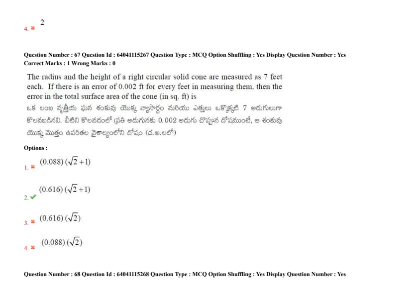The radius and the height of a right circular solid cone are measured as 7 feet each. If there is an error of 0.002 ft for every feet in measuring them, then the error in the total surface area of the cone (in sq. ft) is