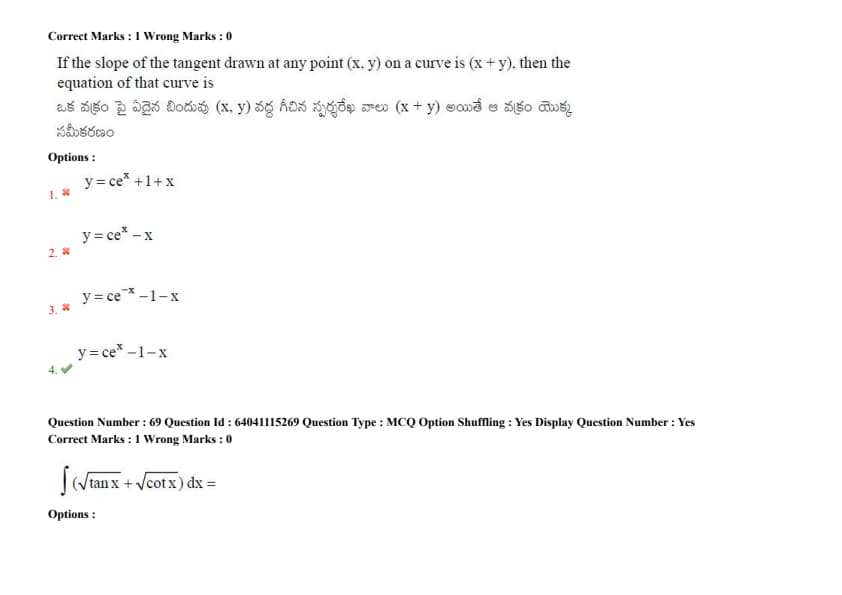If the slope of the tangent drawn at any point \((x, y)\) on a curve is \(x + y\), then the equation of that curve is