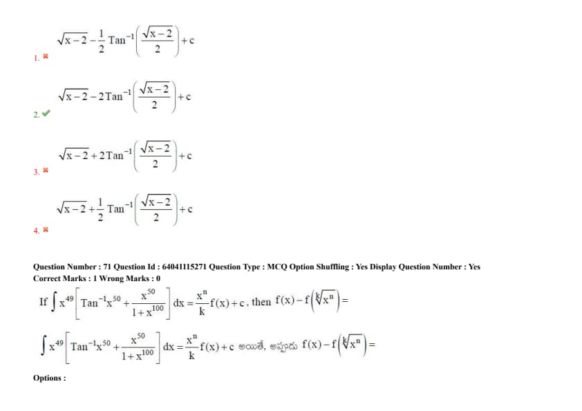 If \(\int \left( \frac{x^{49} \tan^{-1}(x^{50})}{1 + x^{100}} + \frac{x^{50}}{1 + x^{100}} \right) dx = k f(x) + c\) where \(k\) is a constant, then \(f(x) - f\left( \frac{1}{x^{49}} \right) =\)