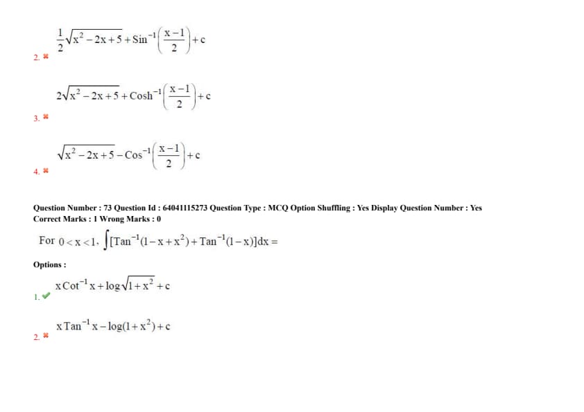 For \( 0 < x < 1 \), \(\int_0^1 \left( \tan^{-1}\left( \frac{1 + x^2 - x}{x} \right) + \tan^{-1}(1 - x + x^2) \right) dx =\)